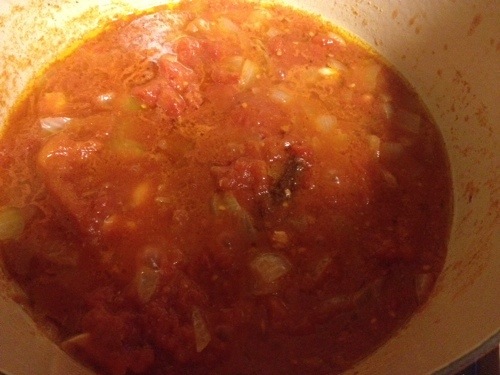 Add the garlic, tomatoes and spices and cook about 3 minutes, until the tomatoes are a bit cooked down.