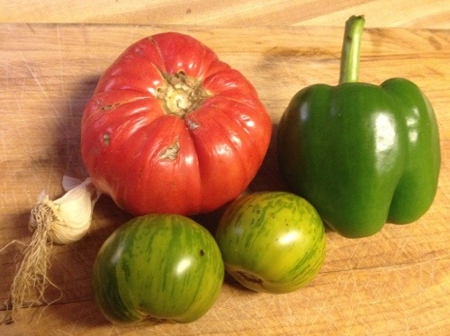 The tomatoes and garlic were sitting on the counter waiting for a job. I rummaged through the fridge and found green pepper and jalapeno (it is amazing how long the veggies from the garden last in the fridge, makes me wonder how old the stuff is we buy at the store). I also had red onion from Beechwood Orchards. The non-local items included baby spinach, Hebrew National salami, mozzarella, and crushed red pepper and seasoning.