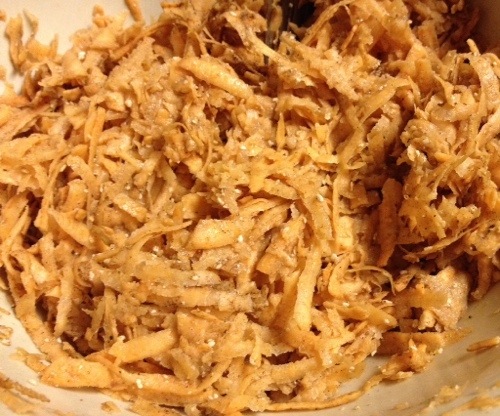 Peel and grate the sweet potato. Wrap in cheesecloth or a dishtowel and squeeze out the excess liquid.