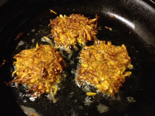 Heat oil in a non-stick skillet until hot. Shape the latkes into 2-inch diameter patties and put in the oil. Cook until browned and flip.
