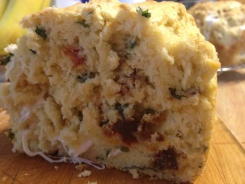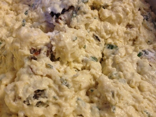 In a large mixing bowl, combine flour, baking powder, baking soda and salt. Mix well. Add the basil, mozzarella and sun-dried tomatoes to the four and mix until all incorporated.