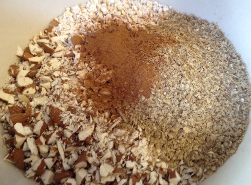 Mix together the dry ingredients: oats, flax, coconut, almonds, cinnamon.