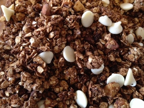 Honestly, how could you go wrong: banana, nutella, almonds, coconut and white chocolate? Add in some flax for health and viola! Yummy goodness!