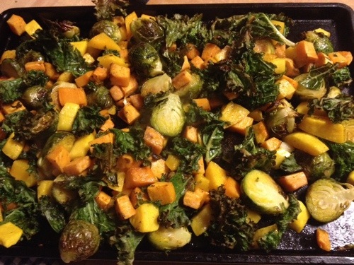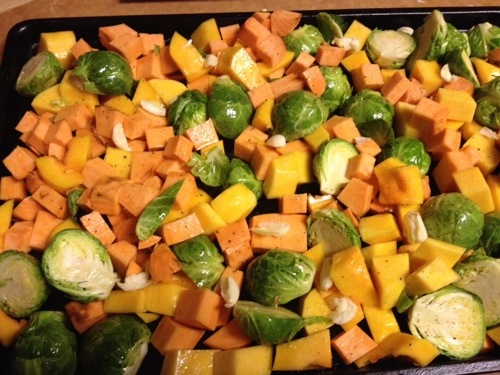 In a large bowl, toss the sweet potato, butternut squash, Brussels sprouts and garlic with the olive oil, 1/2 tsp sea salt and freshly ground black pepper, to taste. Spread on a rimmed baking sheet (if you cannot spread it in 1 layer, use 2 baking sheets).