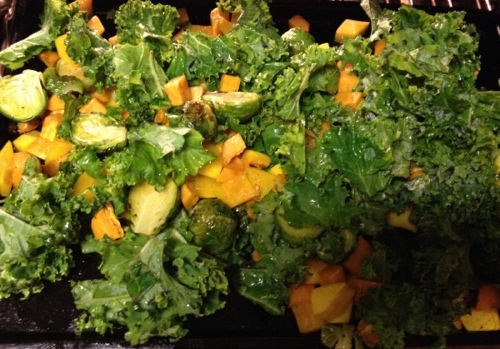 Place the baking sheet of vegetables in the oven and cook for 20 minutes. Stir in the kale leaves.