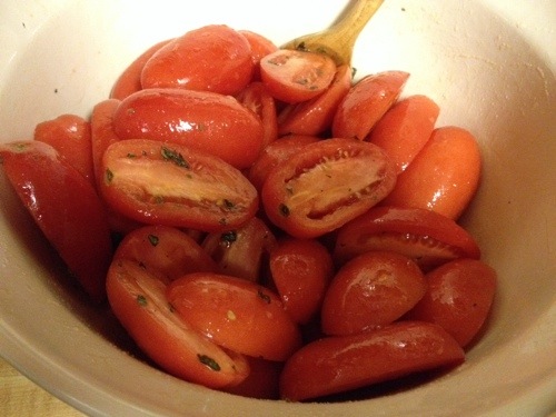I have to admit, this is sneaky. I am missing my garden tomatoes. And all that is available are tasteless tomatoes from the grocery store. I found this recipe (from Cooking Light, November 2012) that takes those “plastic” tomatoes and turns them into a flavor-filled transporter that takes you back to summer and the richness of garden tomatoes.