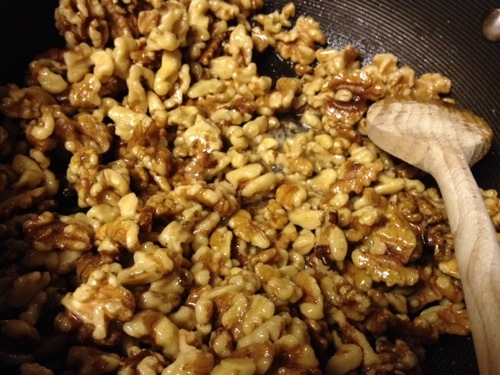 In a large nonstick skillet, heat honey, oil and 1 Tbsp water over medium heat.  Add walnuts, toss to coat.