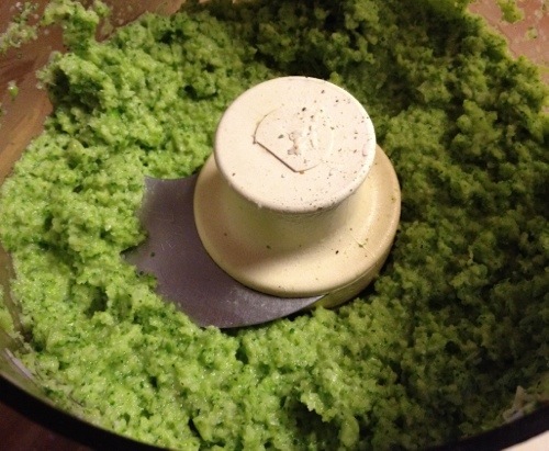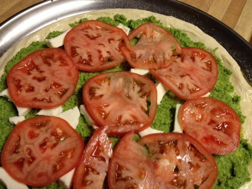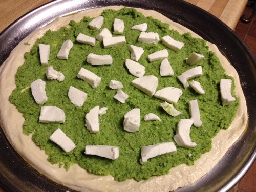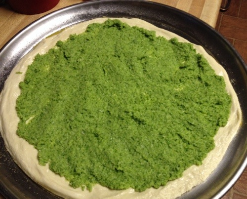 Spread the broccoli pesto over the dough, leaving a border for the crust.