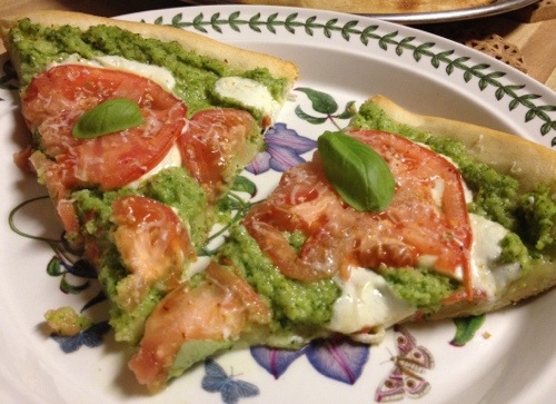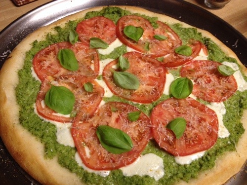 This isn’t your mother’s pesto pizza, it is Broccoli Pesto Pizza. I have adapted a recipe by Ellie Krieger in Food Network Magazine to better fit my family’s tastes…fresh mozzarella (not goat cheese) and adding garlic to the pesto. I think next time I will add some sun-dried tomatoes on top as well – my husband and I looked at each other as we ate it and both thought that sun-dried tomatoes would be a perfect addition.