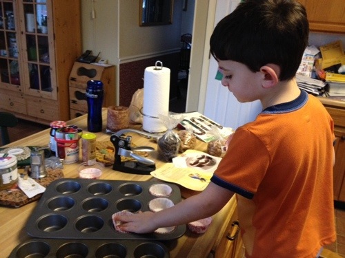 Cam has two treats planned for Valentine’s Day – chocolate raspberry sweetheart cupcakes and candy-filled heart cookies. He started with the cupcakes…