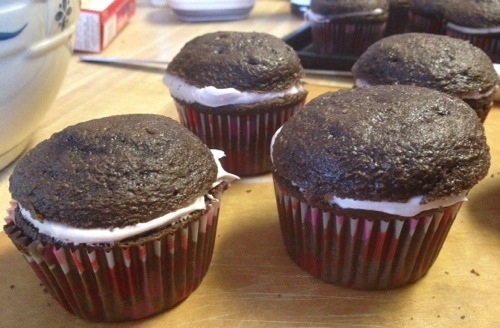 Spread frosting mixture generously over cupcake bottoms, mounding slightly in center. Replace the tops, pressing gently.