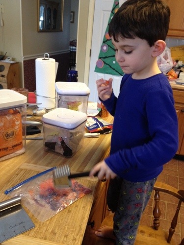 It is our turn to bring snacks to Cam’s pre-K class. They are supposed to relate to the letter R. I wanted to make ROUND banana chocolate chip mini donuts, but Cam insisted we make the heart cookies from his Disney cookbook – they have RED cranberries and candy centers.
