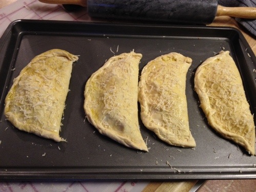 Place the calzones on a baking sheet. Brush with olive oil and sprinkle with grated parmesan.