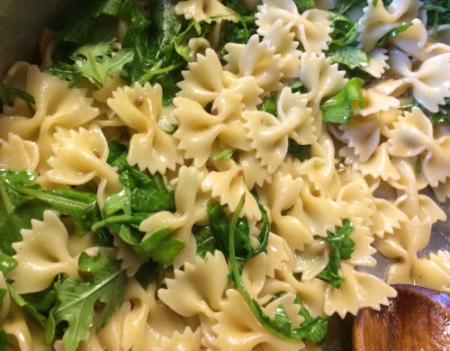 Drain the pasta in a colander and add it to the pan containing the sauce. Add the arugula and toss well. Toss over medium heat for 30 seconds, until the pasta is nicely coated.