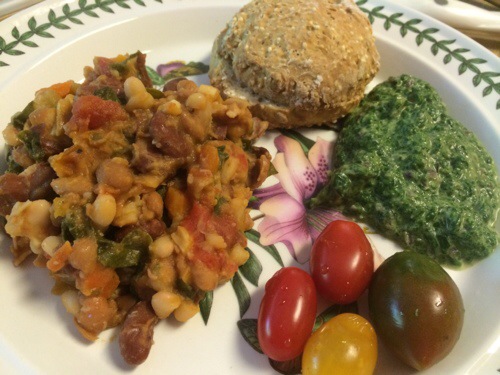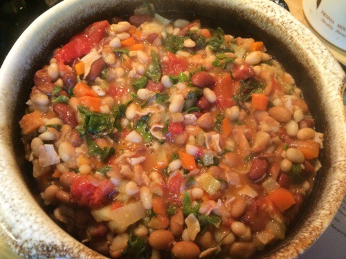 Baked beans with swiss chard and smoked turkey.  Who thought this one up?  Of course my friends in Food Network Kitchens, who else?  It can be a main dish or a side dish, a lunch or a dinner.  We liked it best with some hot pepper sauce added; it made a really satisfying dinner with home-made rolls and borani esfanaaj (a Persian spinach and yogurt mixture – quite delicious spread on the rolls or as a dip).