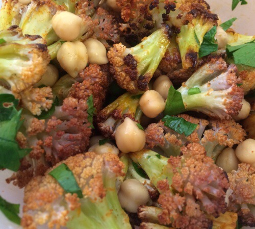 Bring together the roasted, smoked paprika cauliflower, some chickpeas, and parsley along with oil, vinegar and seasoning and you get a beautiful salad or side dish.