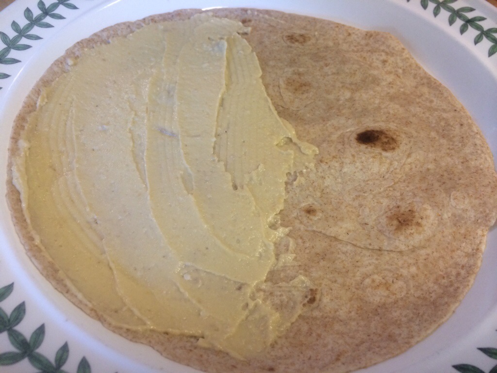 Spread the hummus on the wrap. (the wrap holds together even better if you apply it to the entire wrap, I just wasn’t that hungry)