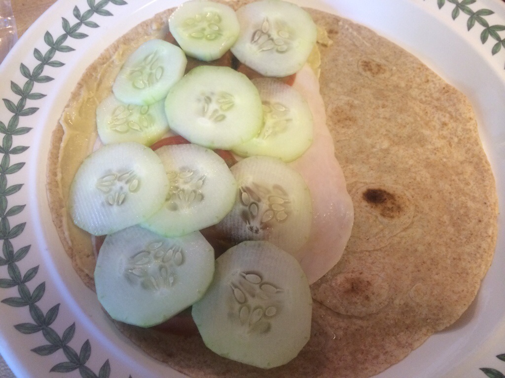 It is an easy, tasty wrap that uses the cucumbers and tomatoes from my garden.  Yes, the tomatoes are finally ripening! Dinner was fast, fresh, tasty, and surprisingly filling. The pictures below are from my wrap, my husband’s wrap was filled more heavily.
