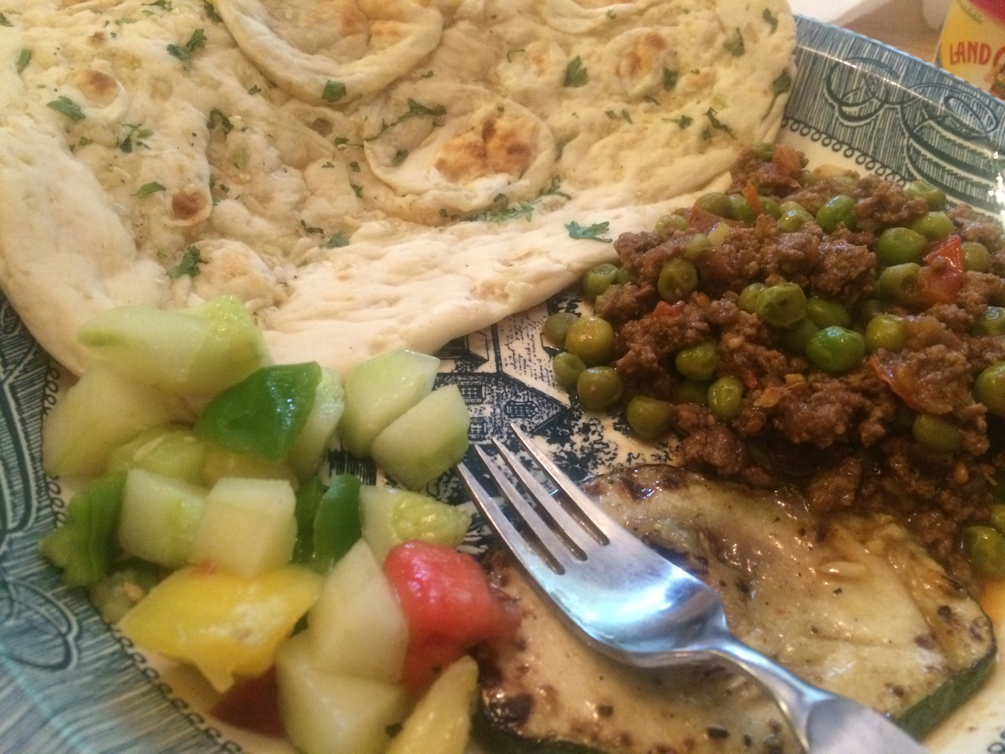 I first had keema last summer when an Indian friend of mine brought it to a pot luck. I was immediately hooked, and very happy when I found a Padma Lakshmi recipe that recreated the yummy goodness of Nafeesa’s dish.Here is my adaptation, which we ate with garden-grown pan-seared okra, pan-seared pattypan squash, salad, and of course, some garlic naan.