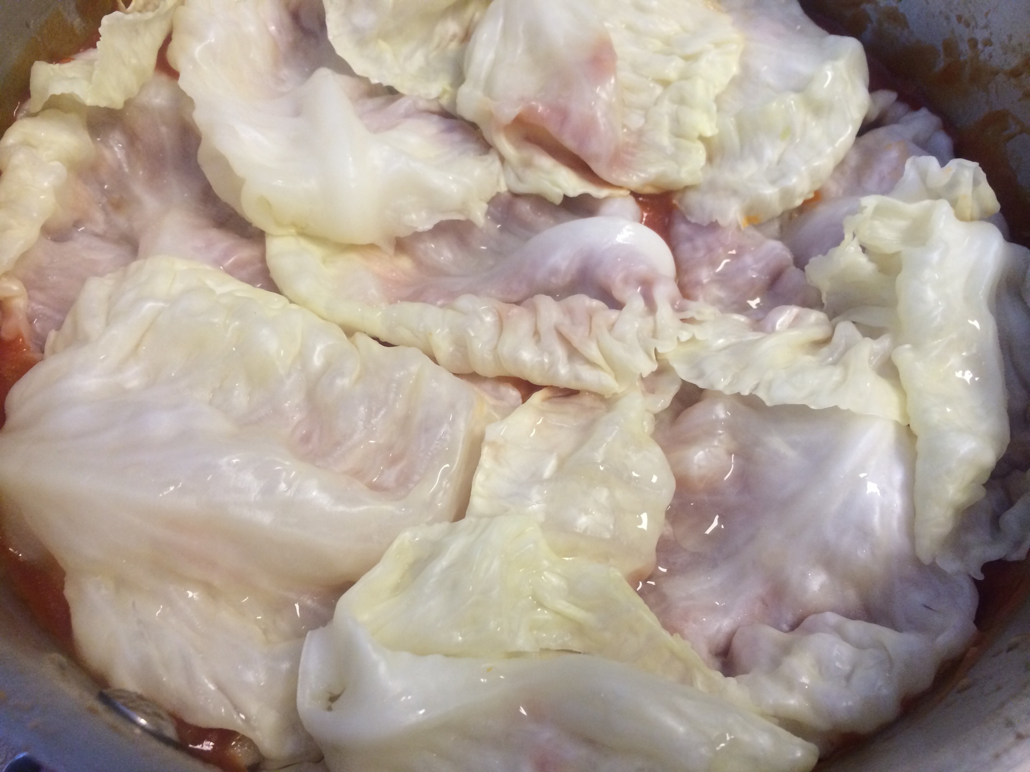 Place into the sauce, seam side down. Continue with all the filling and cabbage leaves, placing the rolls snugly side by side in the sauce. Any unused or torn leaves can be rolled up and stuffed into the gaps in the pan. Make sure all the rolls are covered with sauce. Bring to a simmer, cover and cook for 3 hours, basting from time to time. If the cabbage rolls start to dry out, add more water to cover.
