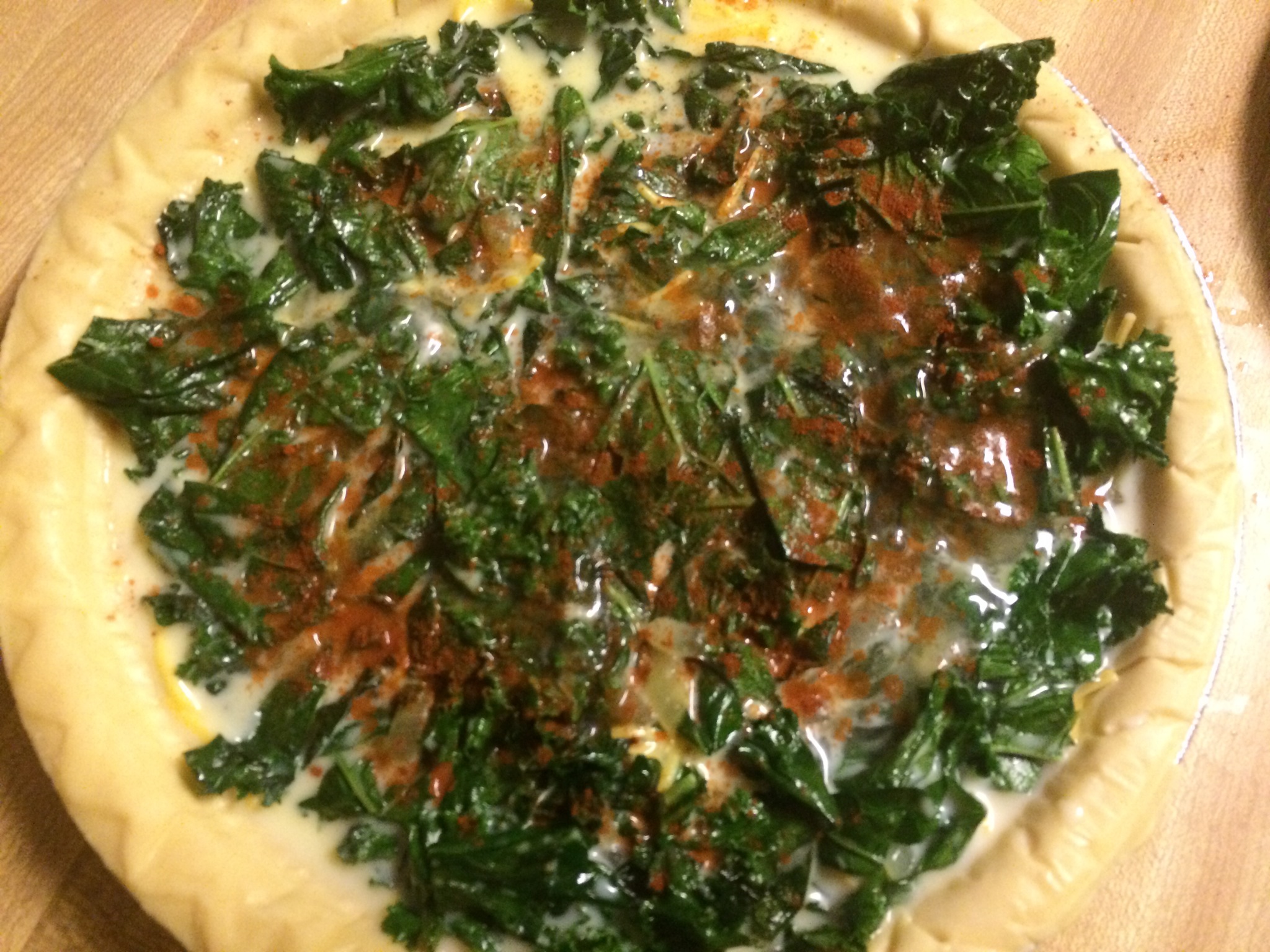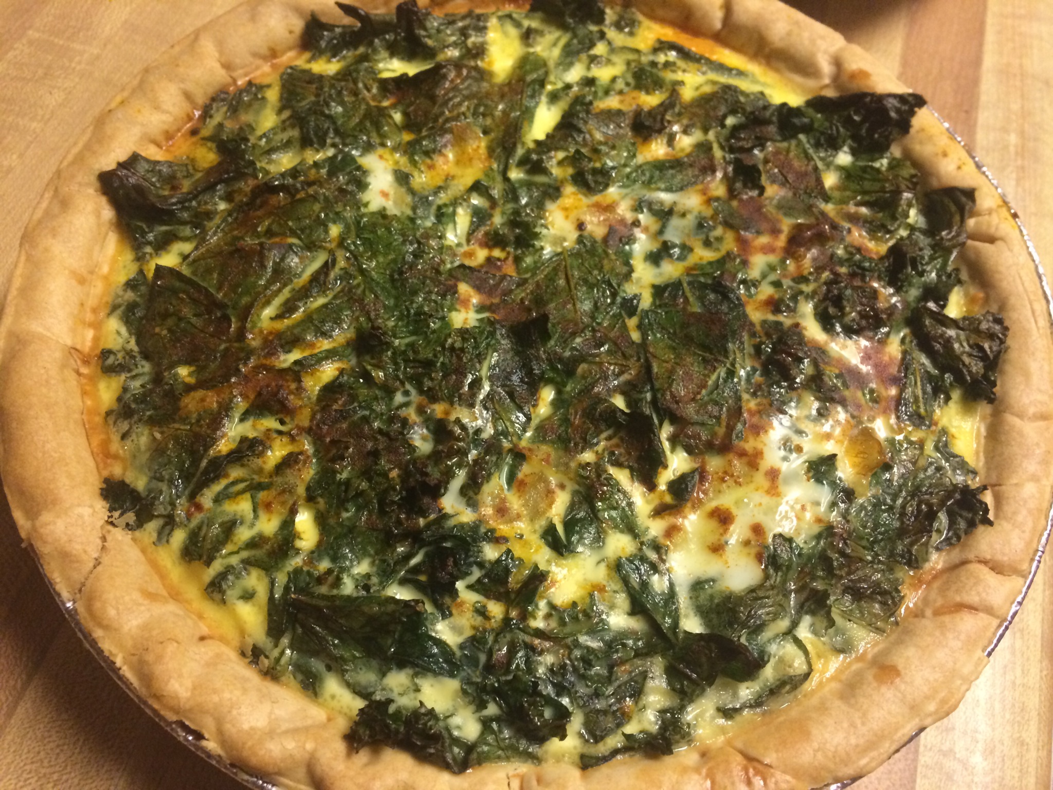 When I stopped at the farmers market last week, I couldn’t resist buying some kale from Beechwood Orchards. But I had no pans for what I was going to do with it. Then I realized that I had a couple of pie shells in the freezer, regular pie shells, not deep dish. I had enough kale to make 2 quiches!
