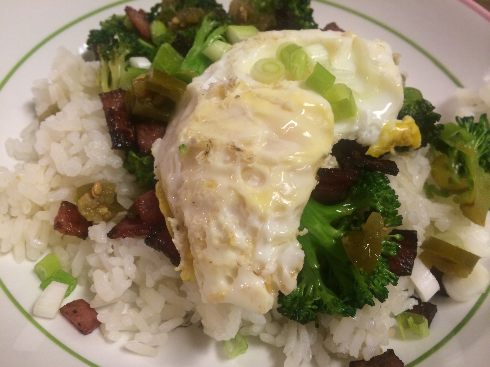 Broccoli from the farmers market, jalapenos from my garden, local eggs & turkey bacon…a fun combination of ingredients.