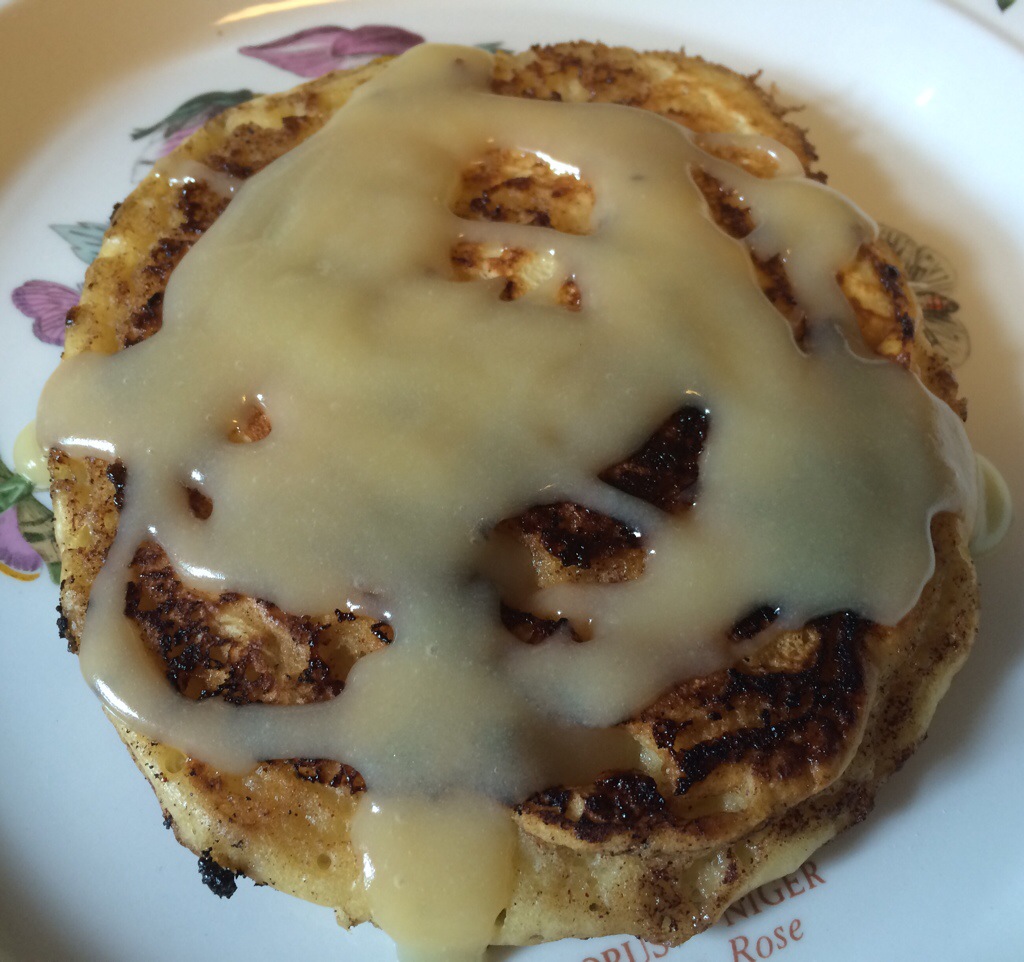 When ready to serve, spoon warmed cream cheese glaze on top of each pancake. Enjoy!