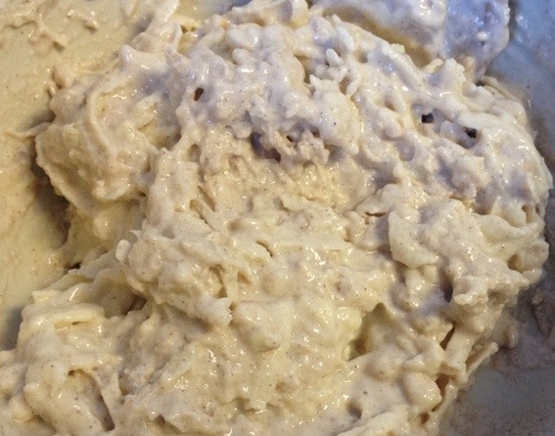 Pour the yogurt mixture into the flour bowl, tip in the apples and fold together.