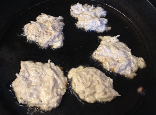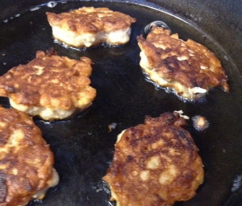 Pour enough oil to come about 1/4 inch up in a skillet and heat over medium high heat. Drop spoonfuls (round soup spoon) of the apple batter into the sizzling oil. No need to make perfect round pancakes.