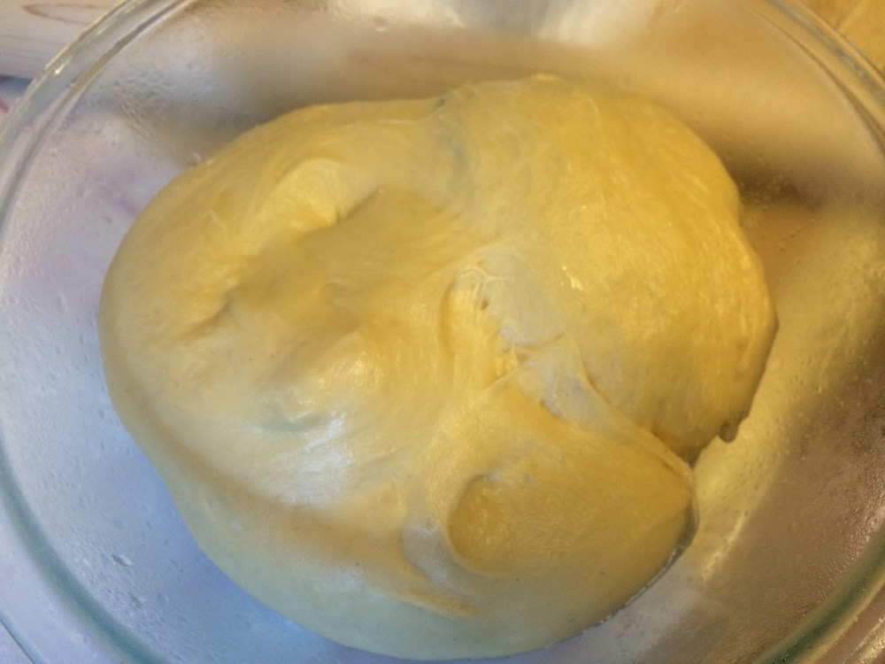 When the yeast has proofed, add it to the dry ingredients, immediately followed by the egg mixture. Mix to combine and knead, either on a floured surface, or with the dough hook for 7-10 minutes, adding more flour as needed, until smooth.
