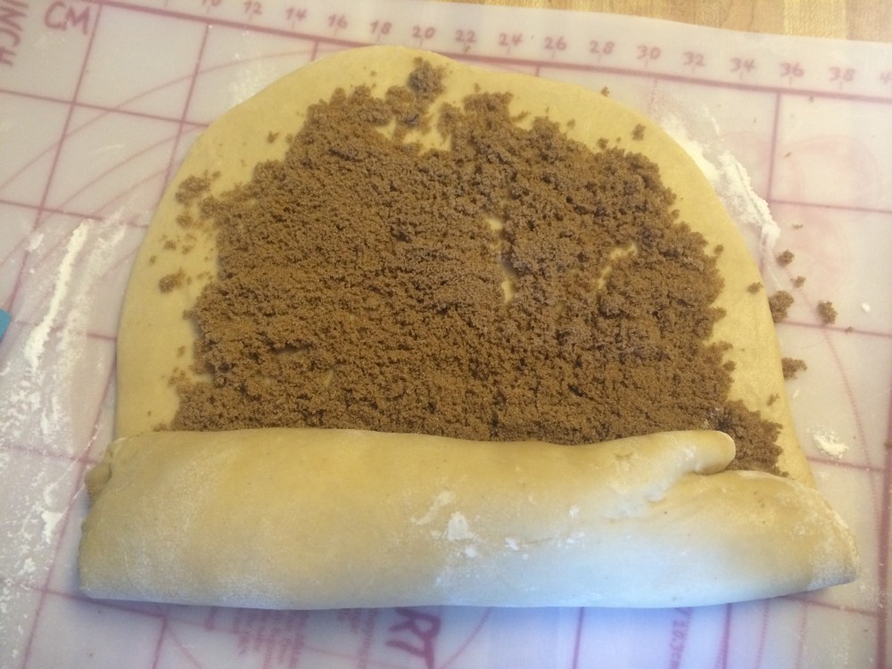 Turn onto a lightly floured surface, and roll the dough out into a large (approximately 10-inch by 14-inch) rectangle. Sprinkle on the remaining cup of brown sugar, and roll it up like a jelly roll.
