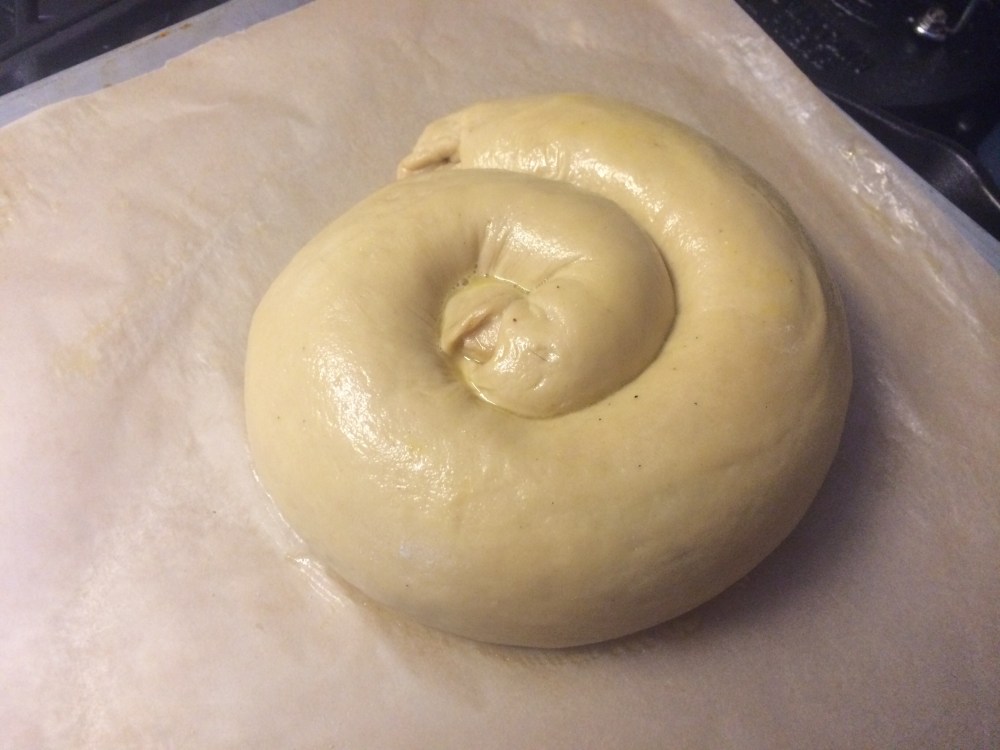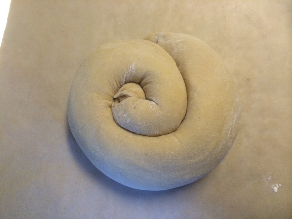 Pinch the edges to seal them shut and then coil into a swirl shape with the seam side down. Place it on a baking sheet lined with parchment.