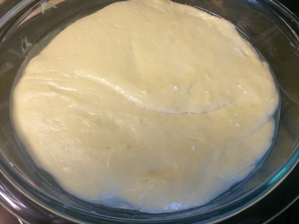 Oil a large bowl and place your dough ball in the bowl. Turn it around so the entire dough is covered with a thin layer of oil. Cover with a clean towel and place bowl in a warm spot and let rise for 1 1/2hours until doubled in size.