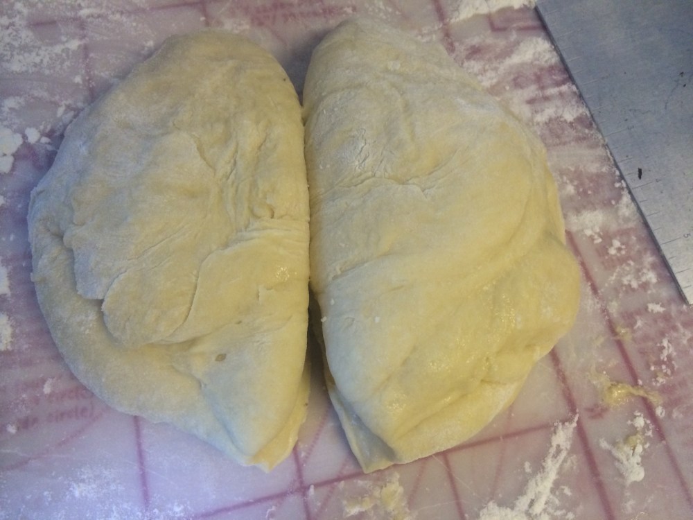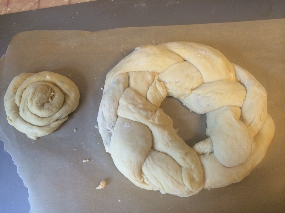 First, I probably was on the low side for flour, it was an incredibly sticky dough. But it worked fine on a well floured board. However, the recipe said it was for 2 challahs (or challot), so I divided the dough in half. But when I then made the three strands from each, they were too thin for holding the filling, it was falling apart. My solution was to keep my first strand as thin as it was, then use the rest of the dough, from both halves, to make 1 larger challah. That worked much better.