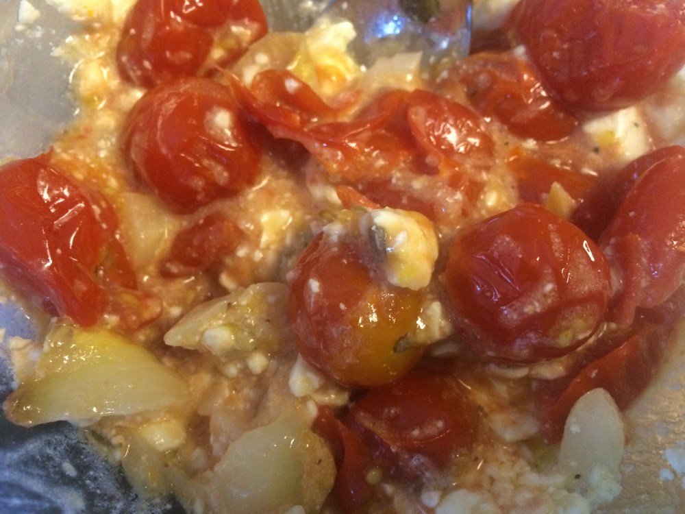 In a baking dish, toss together the cherry tomatoes, garlic, olive oil, salt and pepper and herbs until well coasted. Roast at 400 degrees F for about 15 minutes until tomatoes begin to blister and garlic is soft. Allow to cool and add crumbled feta and fresh herbs.