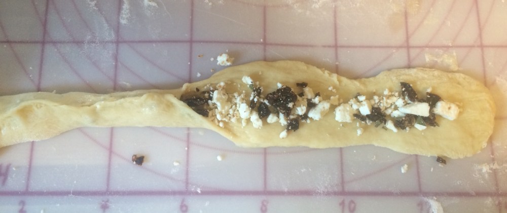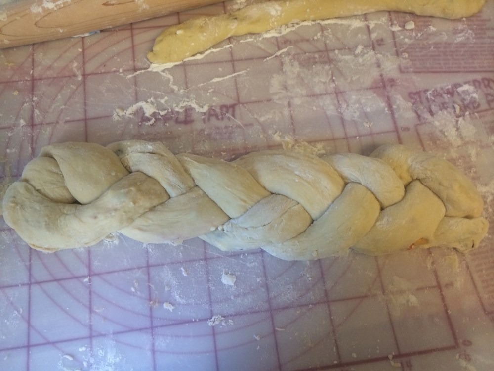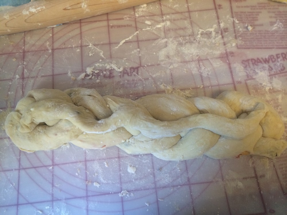 Punch the dough down and knead a bit to soften. Divide dough into 3 pieces, this will be your braid strands. Take 1 of the strands and roll making a long snake, about 15 inches long, but it should be thick enough to stuff, about 1-2 inches thick. Use a rolling pin to flatten the strand.
