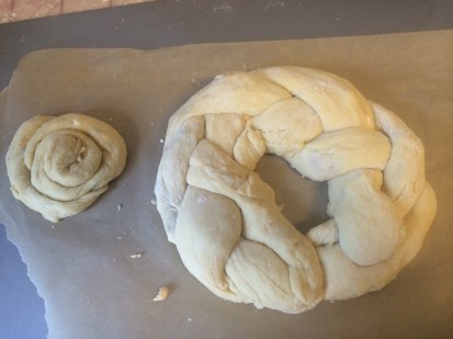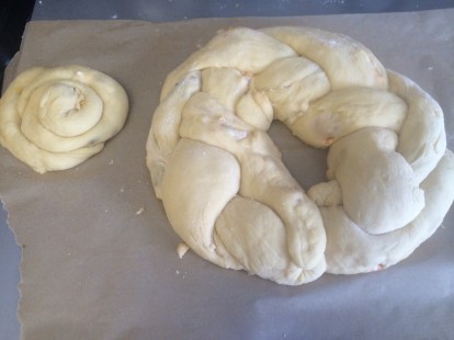 Place on baking sheet lined with parchment paper and cover with a towel. (This is when mine turned into a wreath shape). Allow to rise for another 30 minutes.