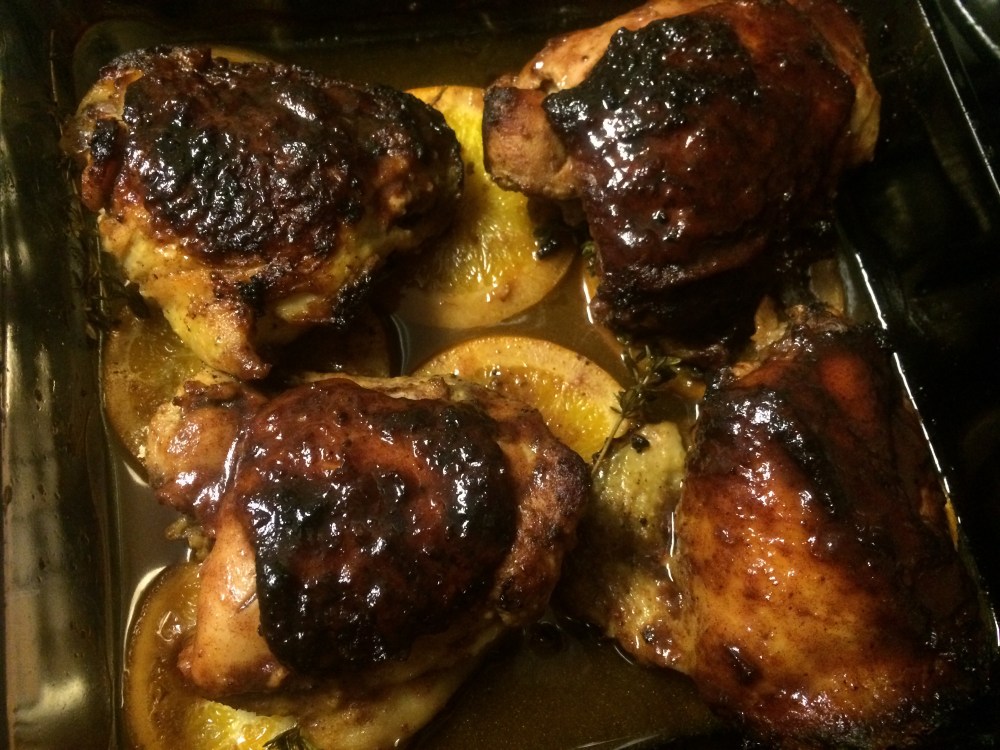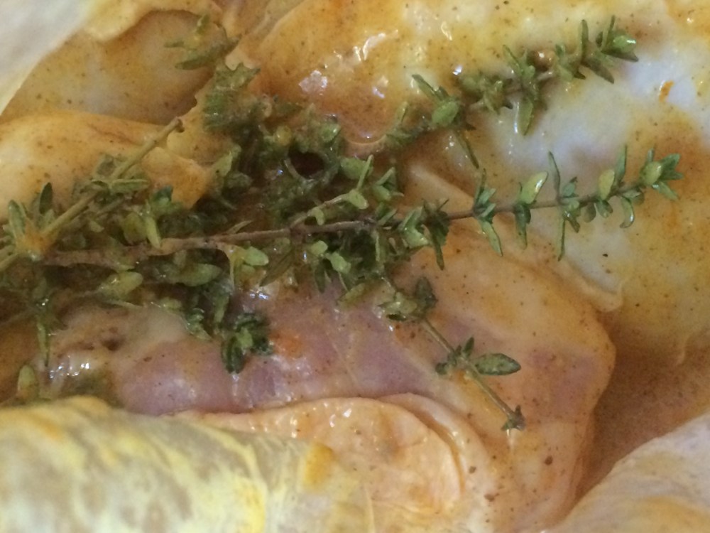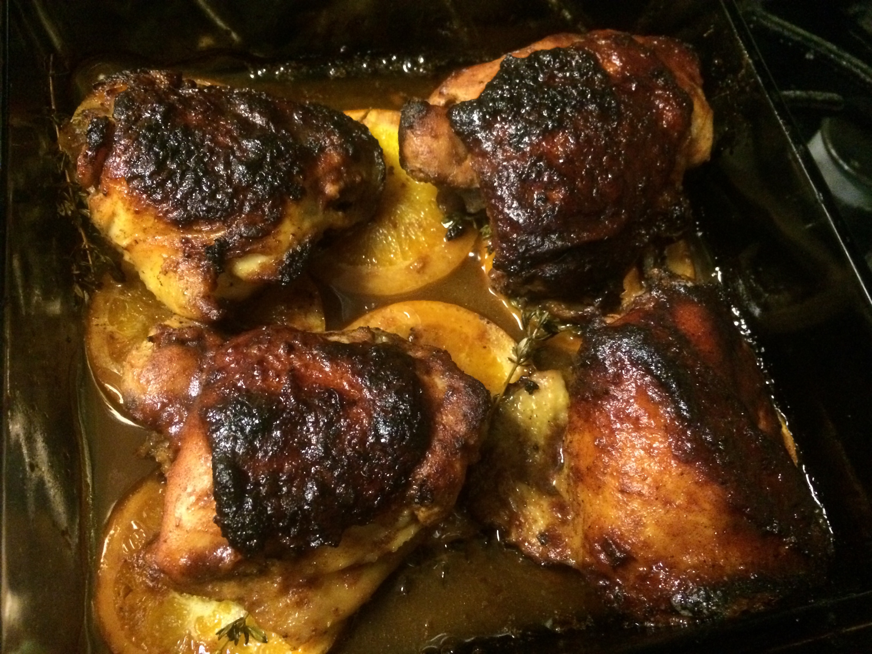 The chicken needs to marinate overnight (or at least for three hours). So plan on prep time the day before. But day of is very simple. You line your pan with orange slices and fresh thyme…
