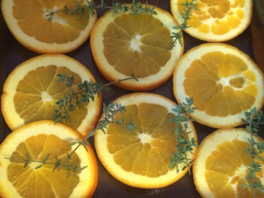 Lightly grease a roasting pan or dish. Slice two of the large navel oranges into rounds and lay them on a single layer, covering the bottom of the pan. Sprinkle some thyme sprigs into the bottom of the roasting pan as well.