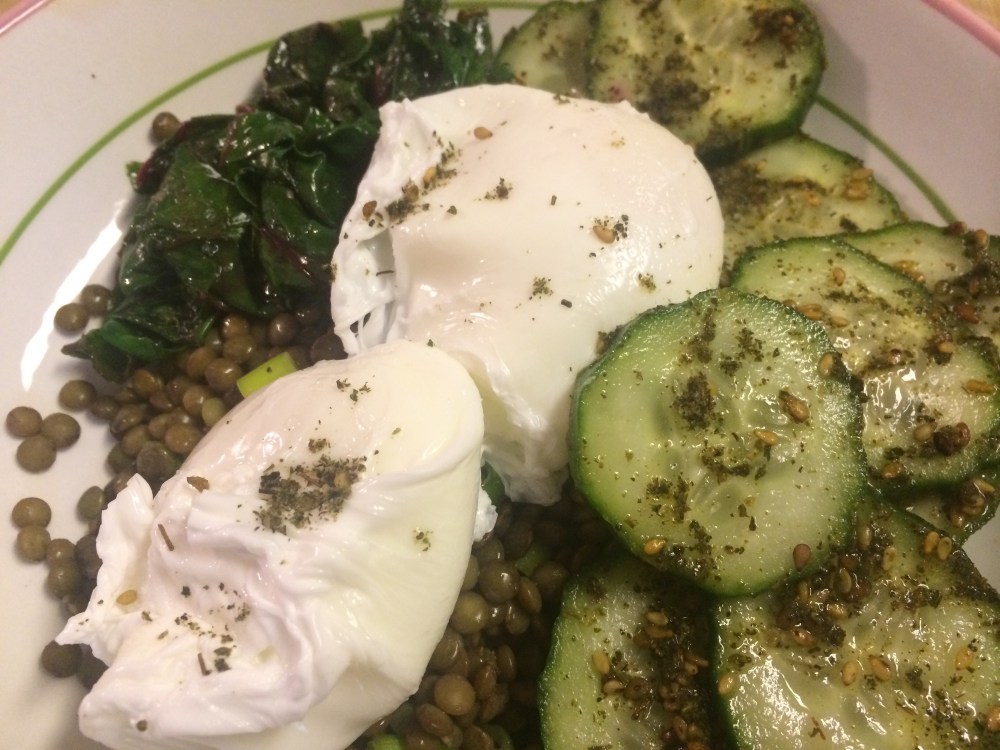 And, I happened to have a recipe from for poached eggs with swiss chard from Bon Apetit magazine that I could work from. It was a really interesting recipe, each piece of the dish was separately flavored and spiced – swiss chard with garlic, lentils with lemon and scallions, and cucumbers with za’atar. When put together, the the egg helped bring the flavors together; it worked far better than I imagined they would.