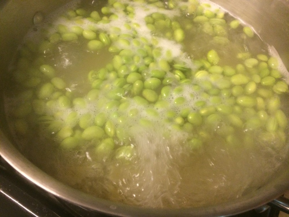 Cook the pasta in salted water according to package directions. In the last 5 minutes of cooking time, add the edamame.