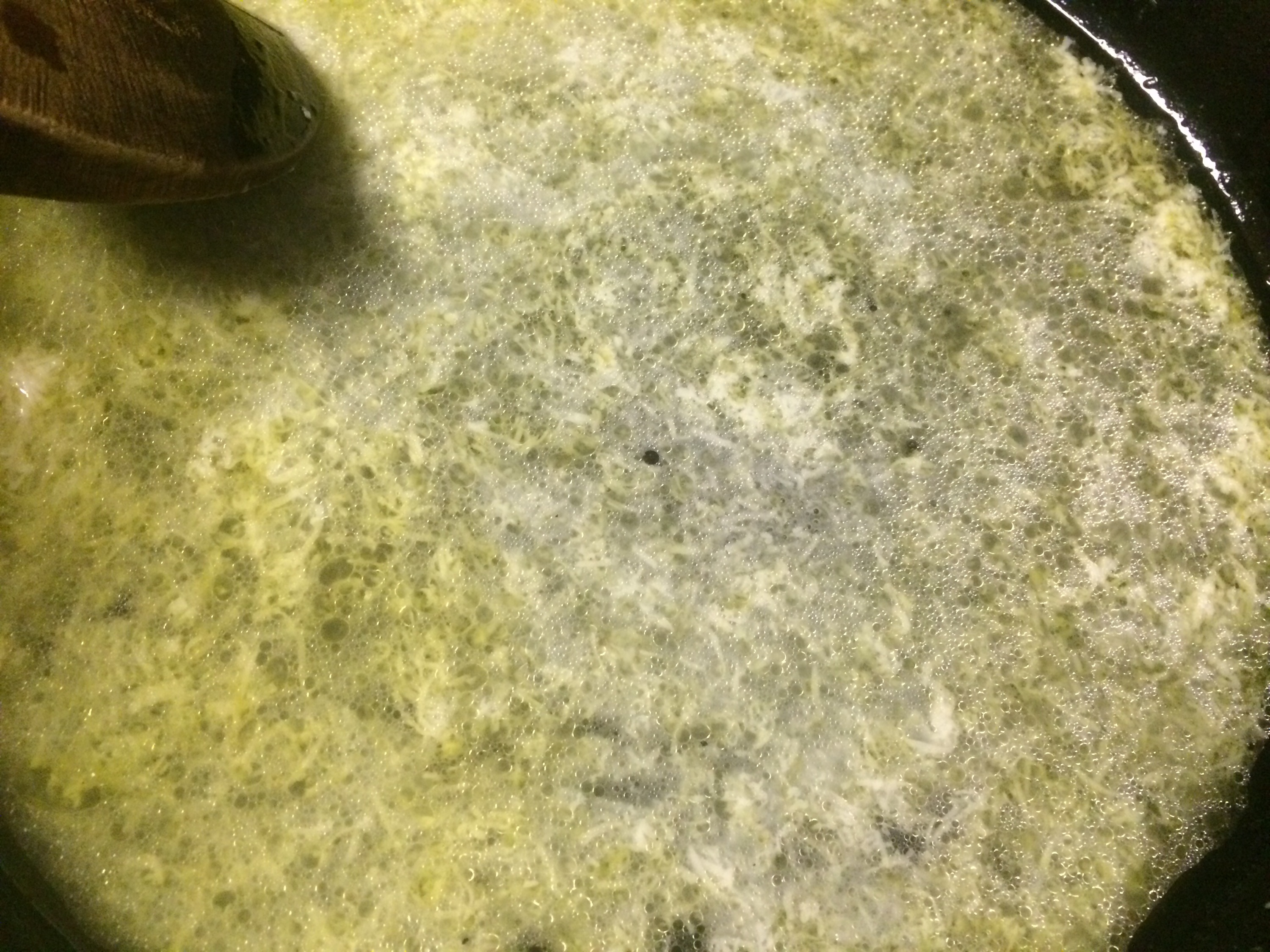 Place the lemon zest and juice in a large skillet over medium heat. Add the reserved pasta water, oil and 1/2 cup of the cheese. Mix well.