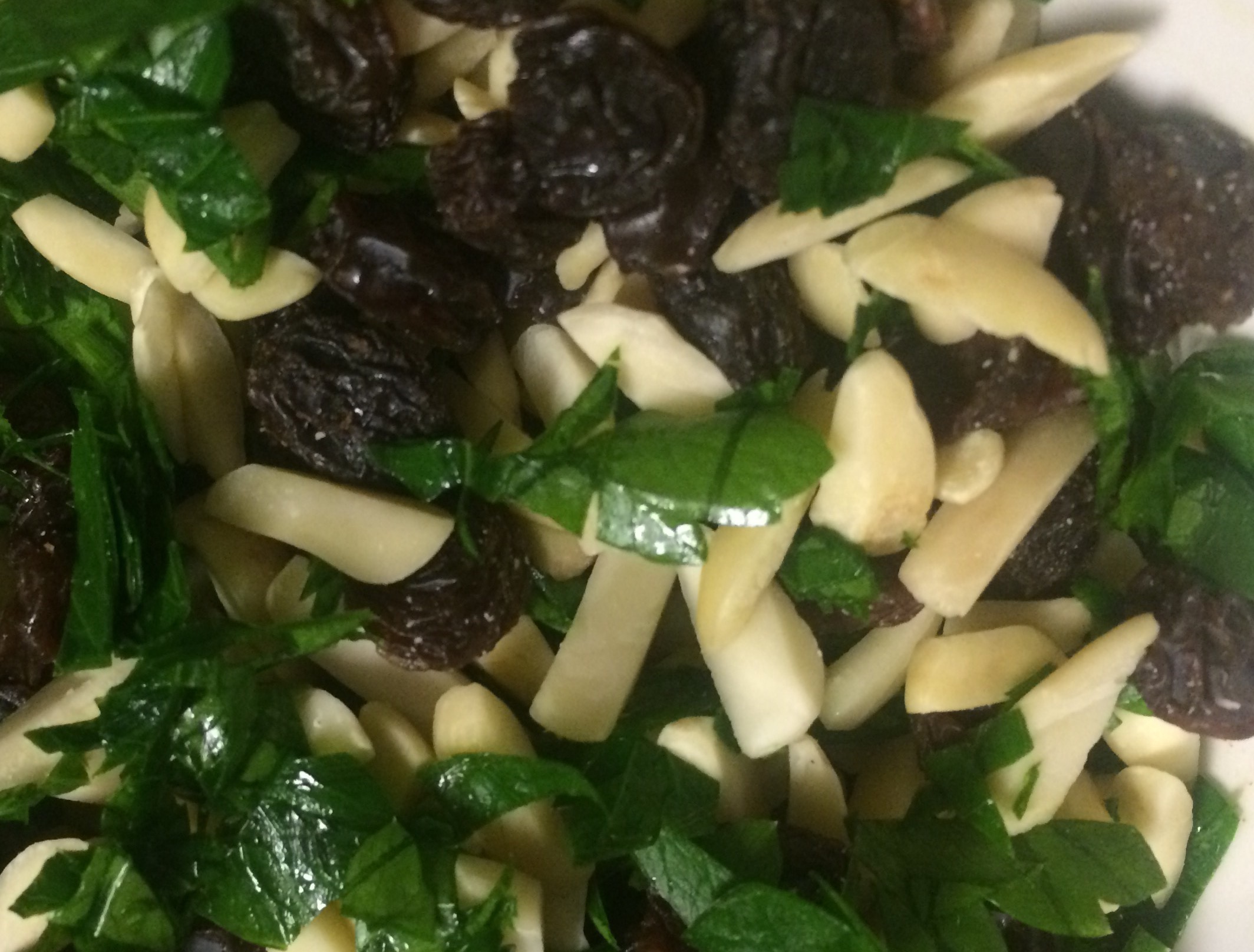 In a small bowl, stir together the parsley, almonds and raisins.