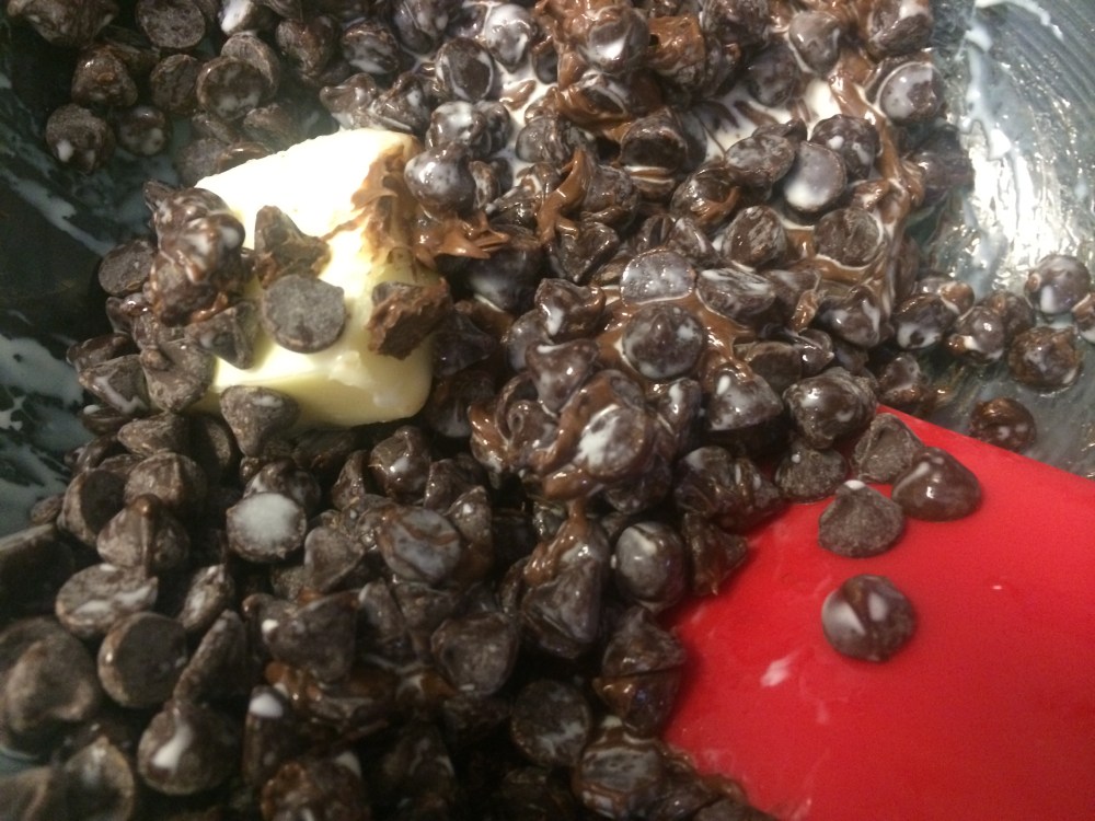 Melt the butter and chocolate in a medium-size saucepan over low heat, stirring often.