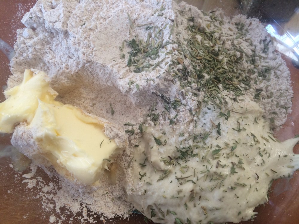 Mix together the flour, salt, sourdough starter, butter, and herbs to make a smooth (not sticky), cohesive dough.