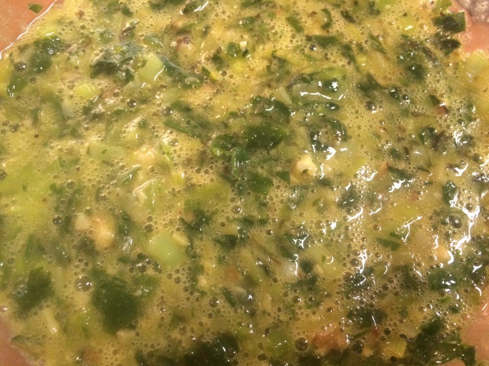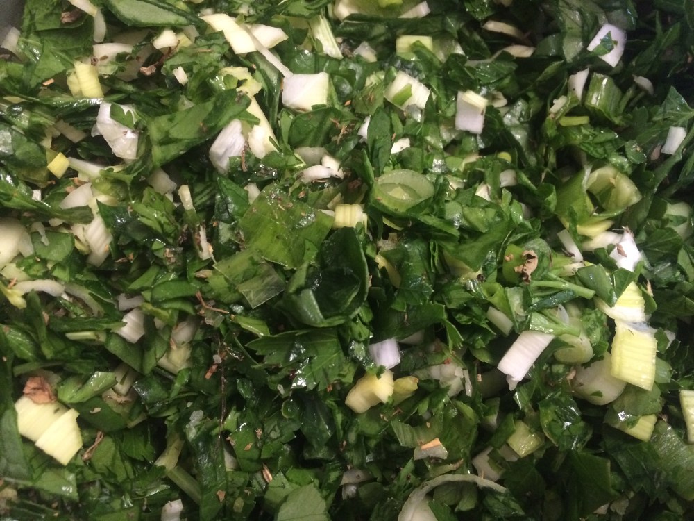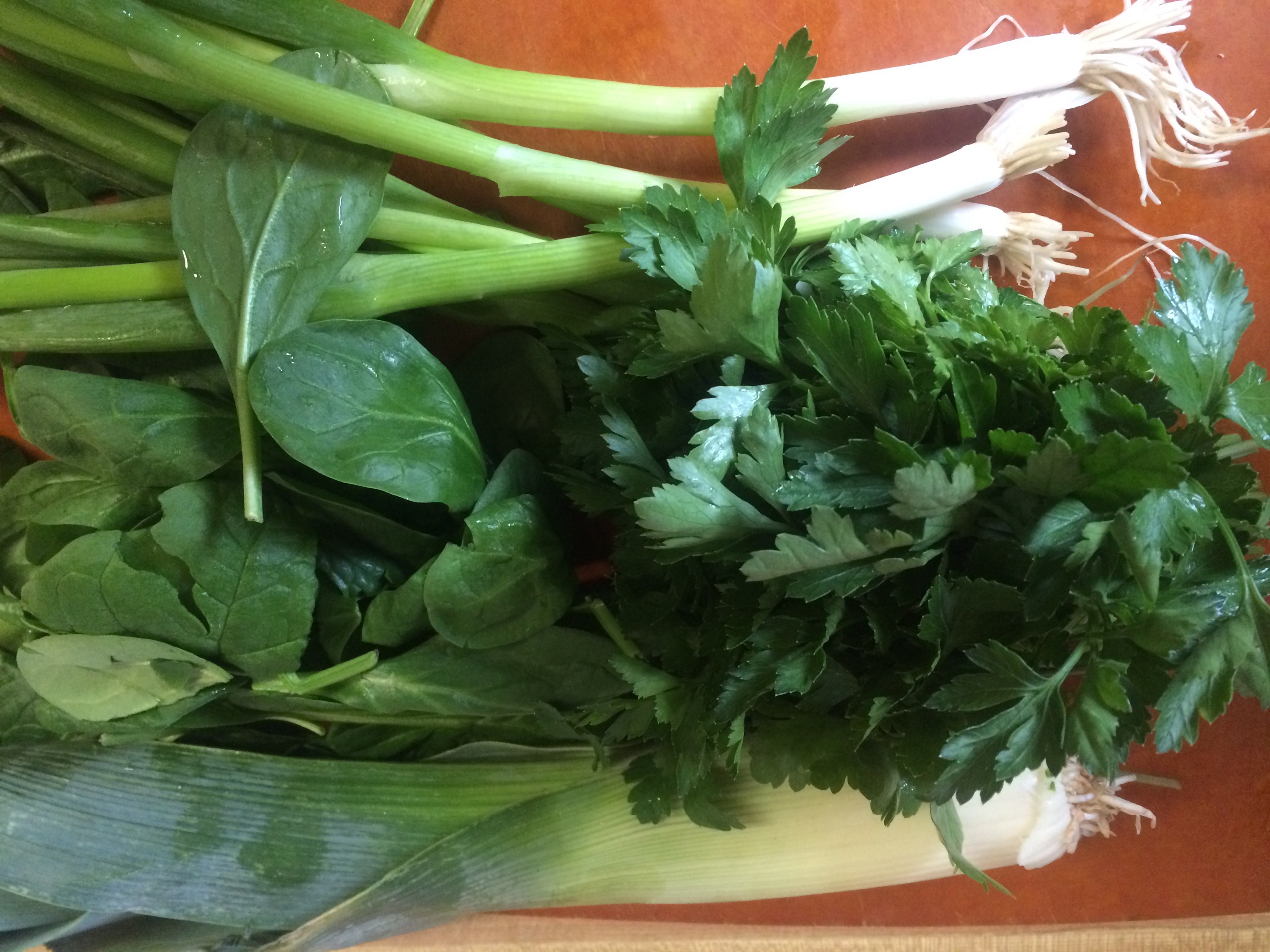 It starts with a mix of herbs and green vegetables. I like to include spinach, although that is less traditional.