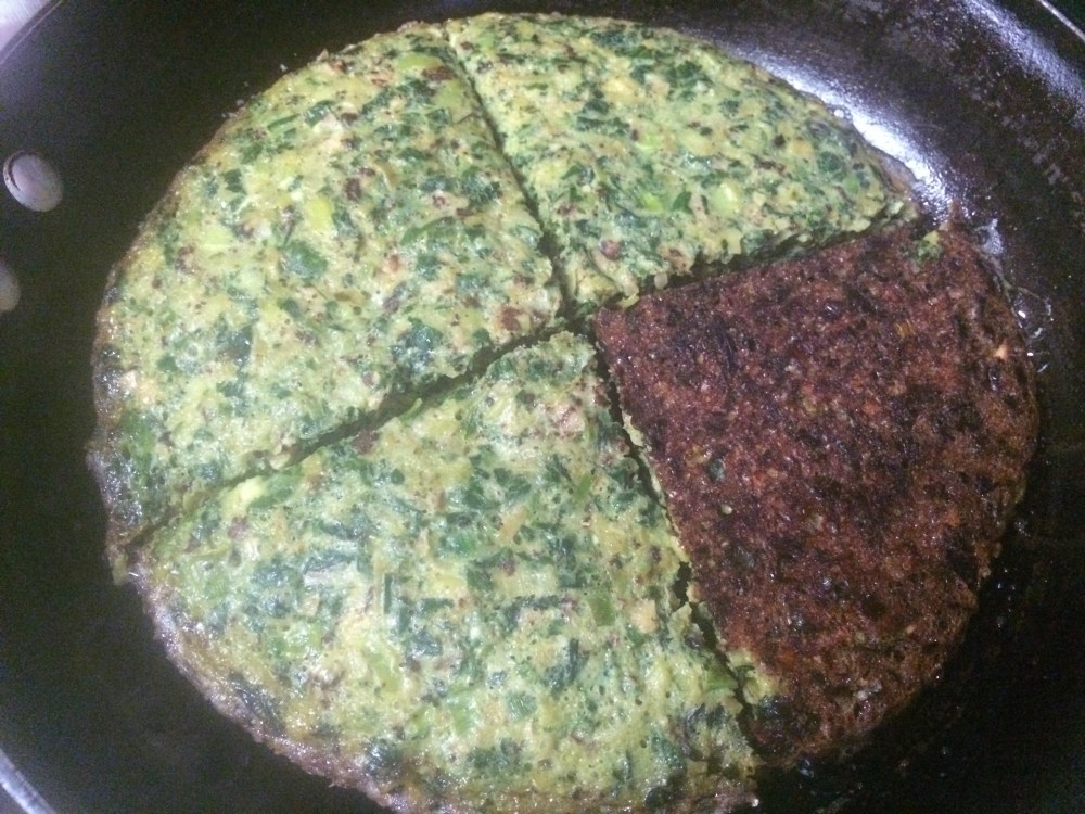Heat the remaining tablespoon oil in the pan over medium-high heat until it is hot. Pour in the egg mixture and flatten with the back of the spatula to evenly spread out the greens. Cover and reduce heat a little, cook for 10 minutes until the bottom is cooked through.