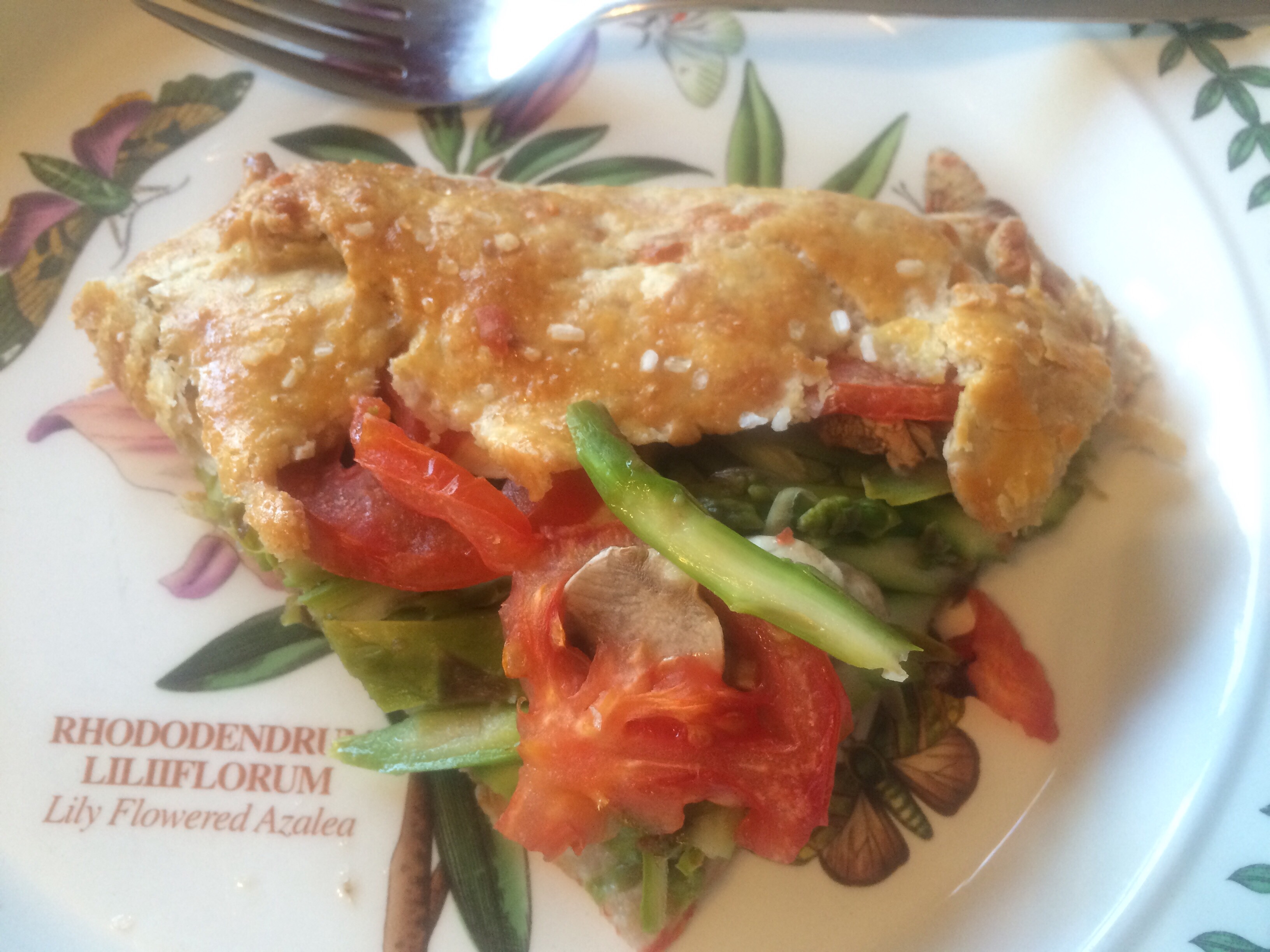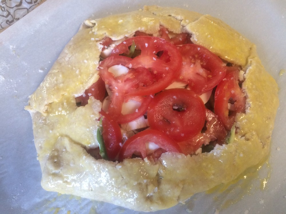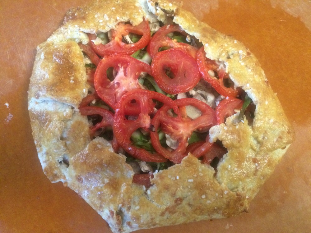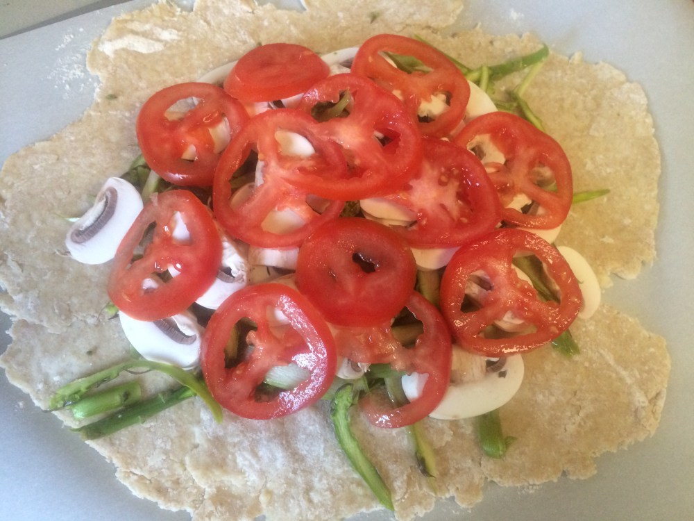 I also am on a mission to use as much of the flour in my house as I can before Passover. I was able to use the rest of my whole wheat flour in cheese pie crust for this asparagus, mushroom and tomato galette.