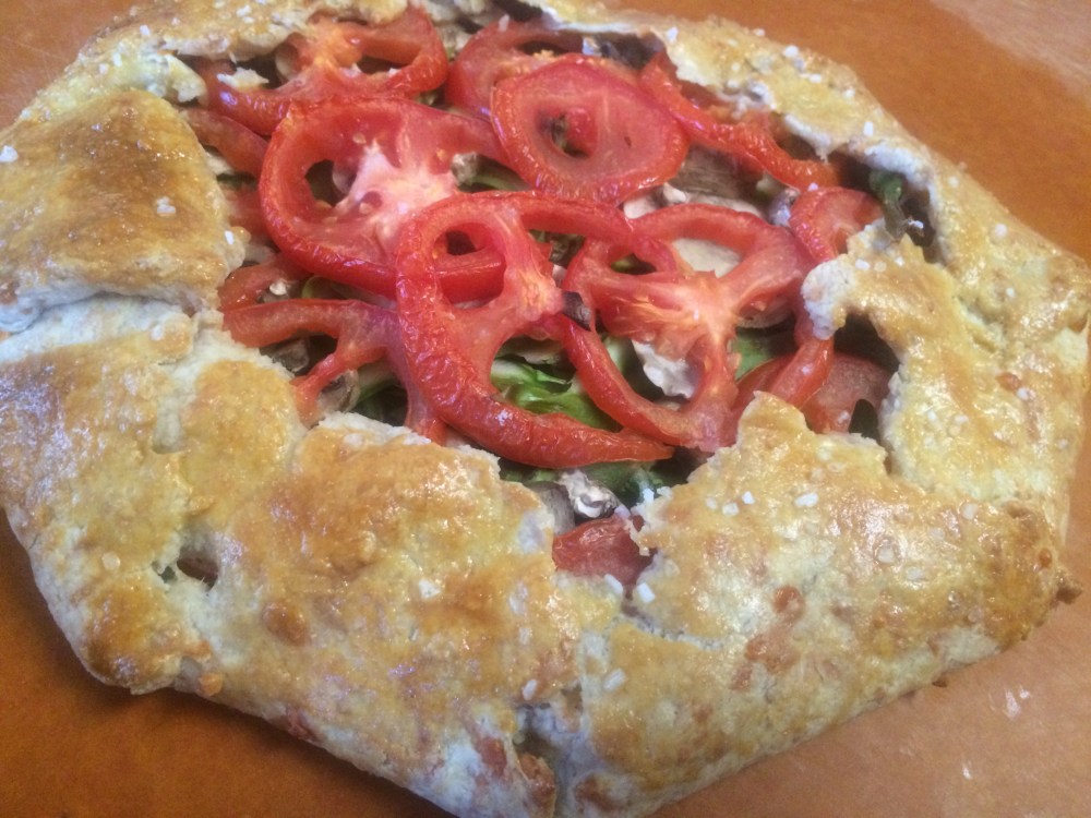 Roll out to a large thin circle-ish shape. Layer on the fillings, leaving a 2-inch border.