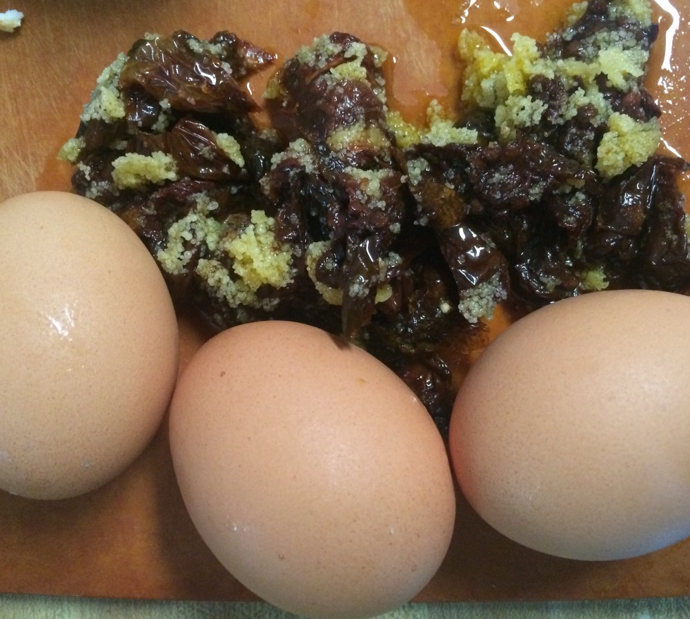 While I wait for my garden to start producing this year I still have sun-dried tomatoes from my garden and eggs from Farmer Kim. These tomatoes were in my fridge, so the oil has solidified a bit. That is fine, it will melt and be quite useful when the tomatoes are cooked.